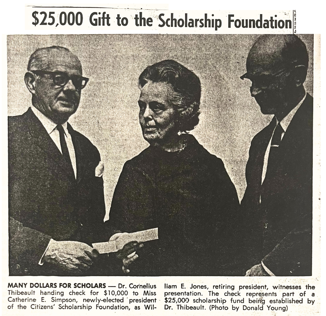 Dr. Thibeault had a passion for helping young people pursue careers in veterinary medicine, animal husbandry, and agriculture. In 1969, during a CSF (later renamed TSF) meeting at the Beebe Library, he surprised the newly elected President, Catherine A. Simpson, by walking in and handing her a $10,000 check. With little fanfare, he added that an additional $15,000 would soon follow—a generous gesture that has left a lasting legacy, continuing to support Wakefield students.