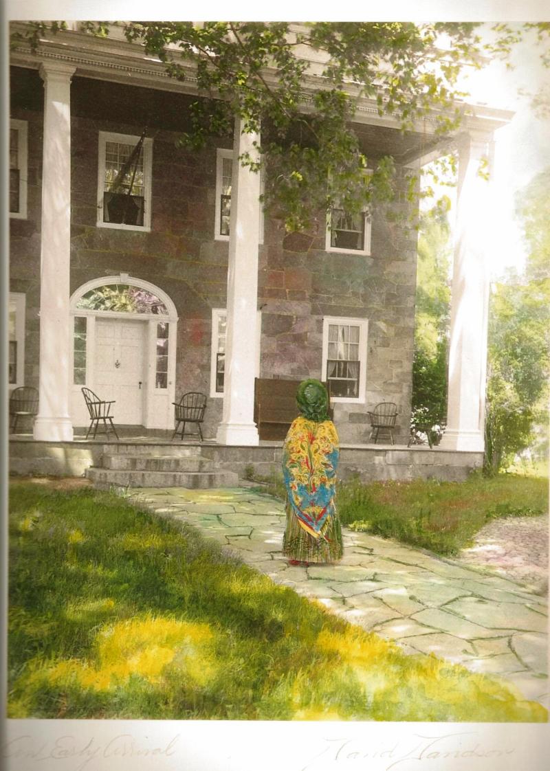 Davidson's camera that he used to take the photographs at Hearthside is set up in a three-dimensional scene, recreating the taking of the photograph to the left, "An Early Arrival." The shawl on the mannequin is the same shawl worn in the original photograph but appears somewhat different because of the interpretation by the colorist. Mrs. Davidson was the model for her husband's photographs.