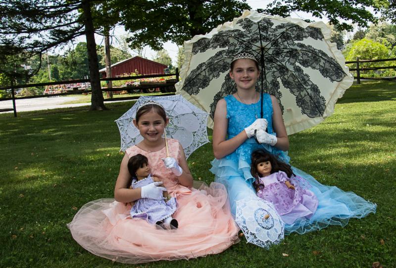 The Bailey sisters, who have attended the American Girl Doll Tea for several years, pose in their party dresses, tiaras, parasols and their dolls.