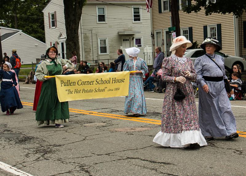 The Pullen's Corner Schoolhouse had its own banner and group of docents representing it. Carrying the banner are Lynn Armstrong and MacKenzie Strom. Kathryn Lawrence and Judy Deighan were at the end of the Hearthside section and before the schoolhouse.