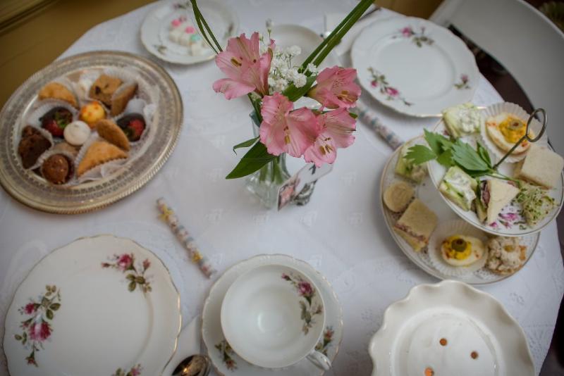 Delectable sandwiches and sweet treats on tiered dishes are set at a table adorned with fresh flowers, linen and dainty china. A decorated rolled cracker, a Victorian version of a fortune cookie, completed the setting.