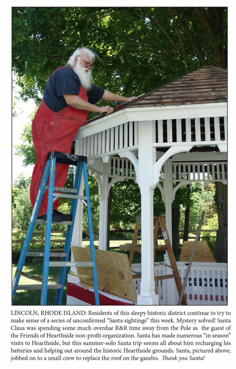 Have you seen heavier traffic than normal along Great Road? Could be that cars are slowing down as they caught sight of the man in red working on the roof of Hearthside's gazebo. That's right, Santa took some time off to give back to the community by volunteering at Hearthside!