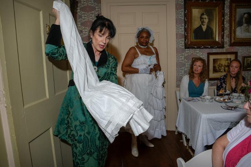 | Estelle Barada shows her bustle and demonstrates putting on a corset as part of the presentation on the Victorian bridal trousseau. Photo by Susan Gonsalves |