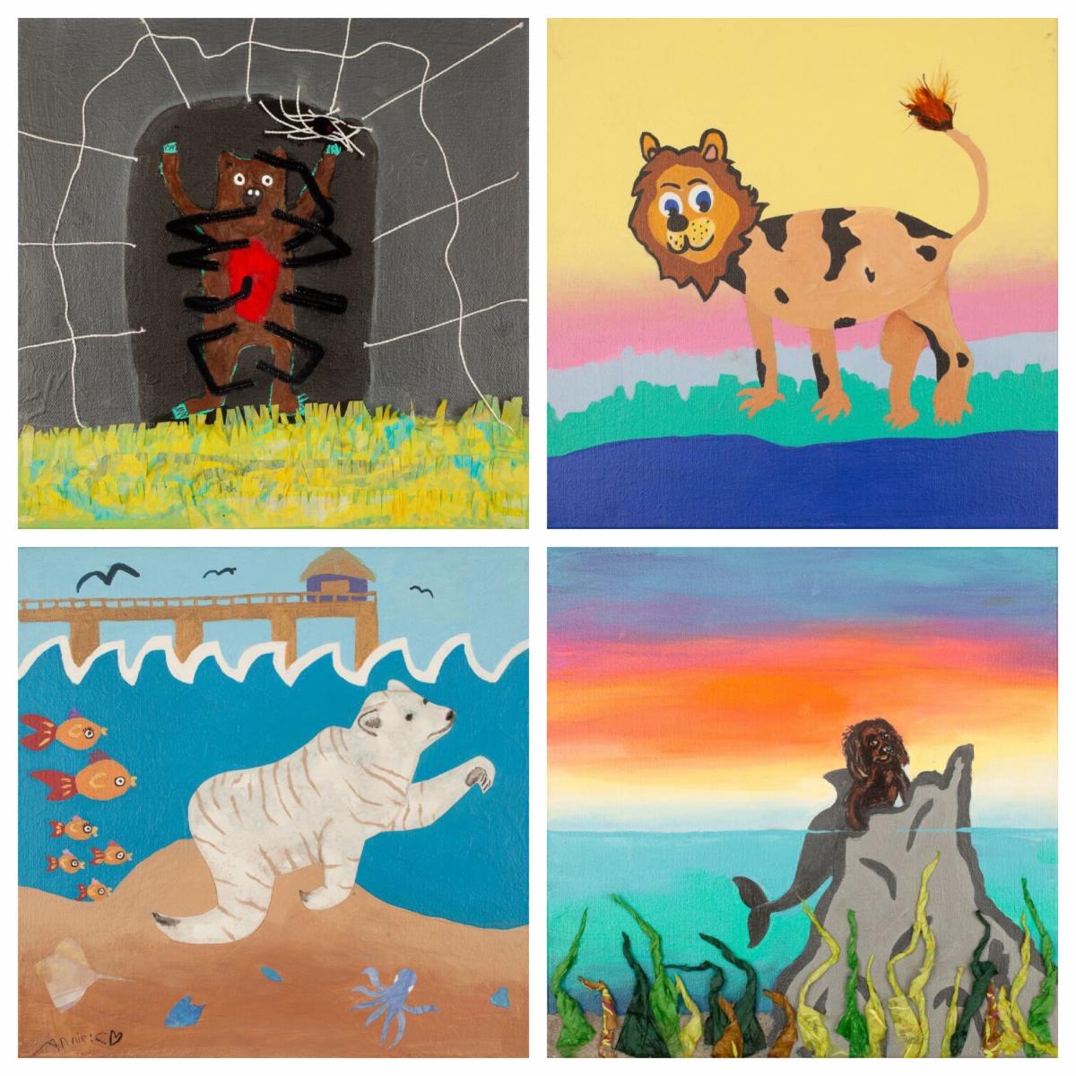 The exhibition is creatively entitled “Animal-Gamation” — since the AWAHIH artists partnered with patients to create unique Animal-Gamation of different animals! Patients explored their own stories and identities in animal form by creating collages on canvas using paint, sand, feathers, pipe cleaners, gems, and much more. This thoughtful show encouraged introspection, inviting the patients to show some of their personality traits and characteristics by creating their own mythical creatures. Where else can you find animals such as a "Lihena", (pictured top right)? The