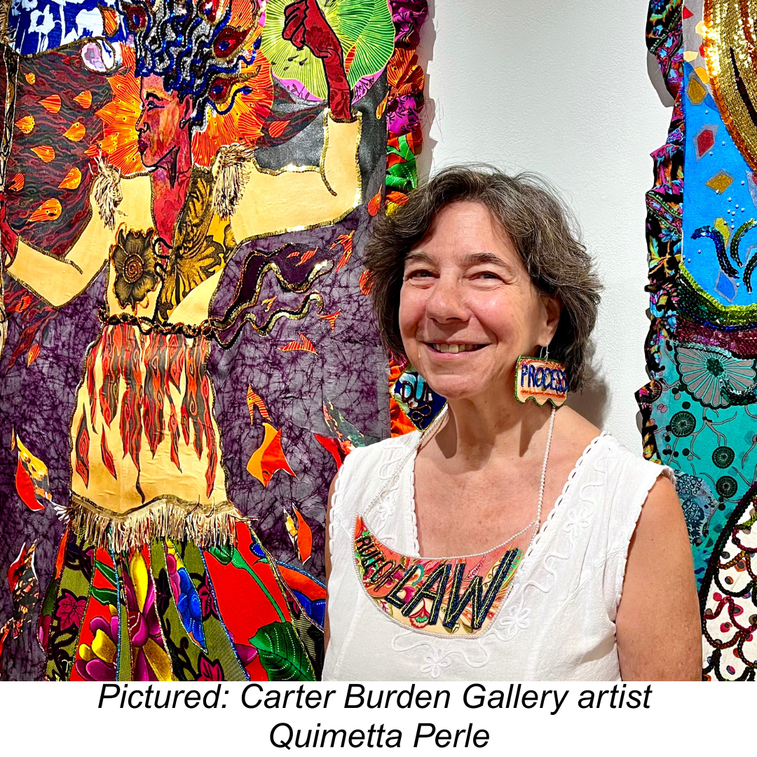 "I am very happy to be showing three of my major textile pieces at Carter Burden Gallery. These fabric works delve into different political and emotional spaces that women occupy. Liberty is an emphatic expression of the desire and thirst for freedom, embodied by a militant, allegorical Liberty. She is depicted as a strong, Black woman, very similar to the one I hoped would be leading the American people. Mermaid and Creatures of the Sea and Air is dazzling and joyous. It celebrates the ability to survive and thrive in diverse environments, negotiating the depths of the subconscious as well as the workaday world of the surface. This is not The Little Mermaid, a foolishly romantic Disnification, but an older, wiser mermaid. Witness (for Shazia Sikander) is a gesture to an artist whose beautiful bronze statue honoring women’s strength was beheaded by a man with a hammer. It is spiritual in nature, celebrating the triumph of the spirit over the hatefulness of the perpetrator."