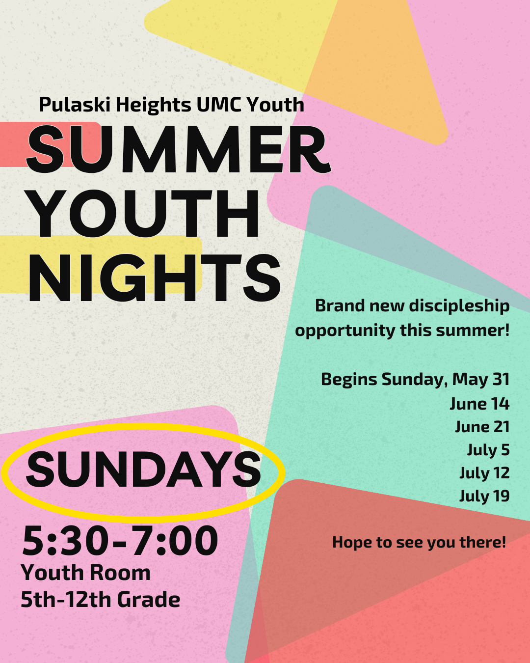 First, we are so excited to be offering regular "Youth Nights" in June and July. Youth Nights will be structured similar to school-year youth, feel a bit like old-school youth group, and will include all ages (incoming 5th-12th graders). We'll eat dinner together then participate in a video teaching and small group discussions.