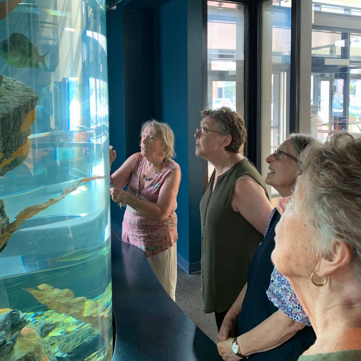 GMRI staff member Margaret (far left) discusses the local marine life in GMRI's teaching aquarium for Victoria Mansion docents. | |