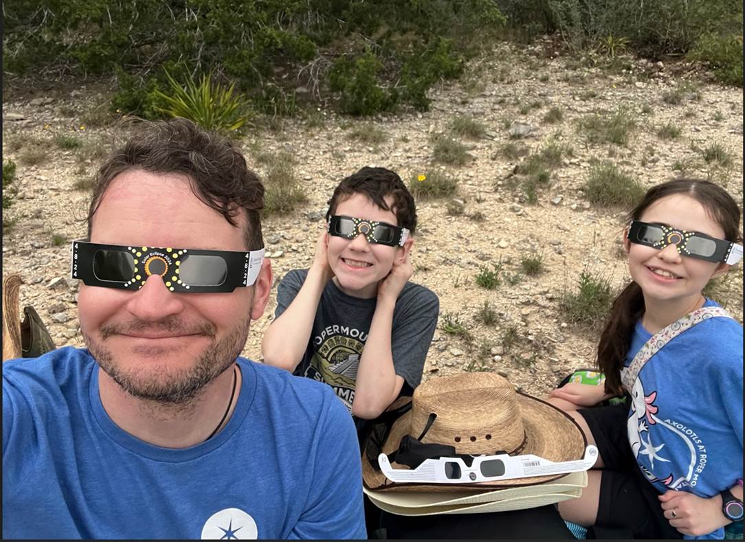 Michael Weeks, RMSC Director, and family enjoyed darkness in the Hill Country of Texas. He reported that the birds were active and sang more during the partial eclipse but continued singing during totality as well.