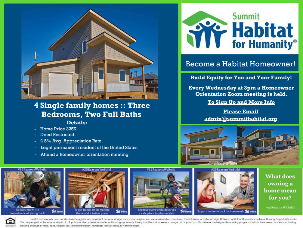 Habitat for Humanity of Summit County is a tax-exempt 501(C)(3) nonprofit organization, EIN 84-1312622. Your gift is tax-deductible within the guidelines of U.S, Law. A receipt will be emailed to you after your donation.