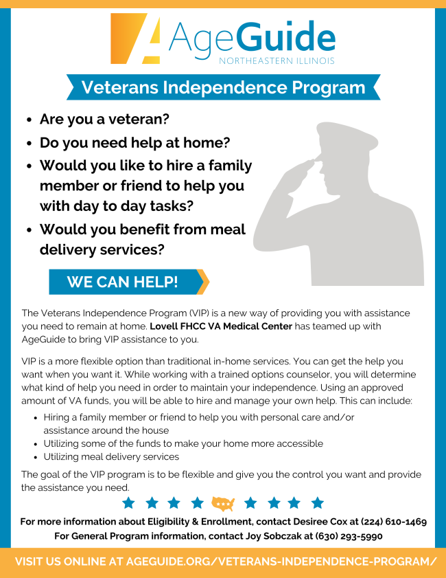 The Veterans Independence Program (VIP) is a new way of providing you with assistance you need to remain at home. Lovell FHCC VA Medical Center has teamed up with AgeGuide to bring VIP assistance to you.
