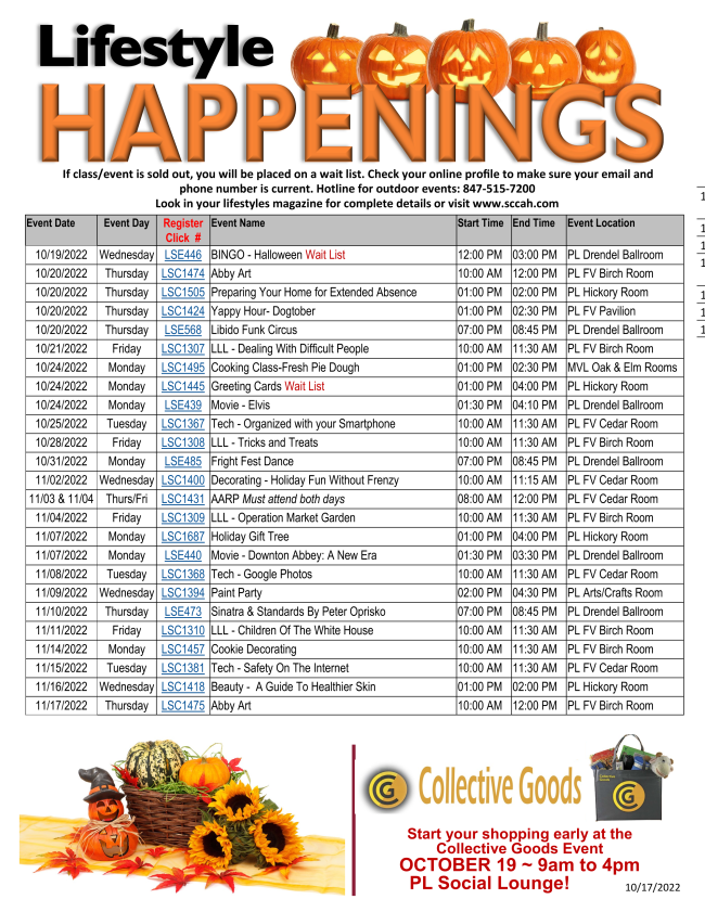 LSC1308 Tricks & Treats: Join us Friday, October 28 at 10am in the Birch Room to hear speaker William Pack share the cultural history of Halloween. Click here.