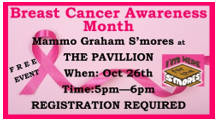 Join us on Wednesday October 26th from 5-6PM at the Pavilion, wear pink and enjoy some Mammo Graham S’mores!