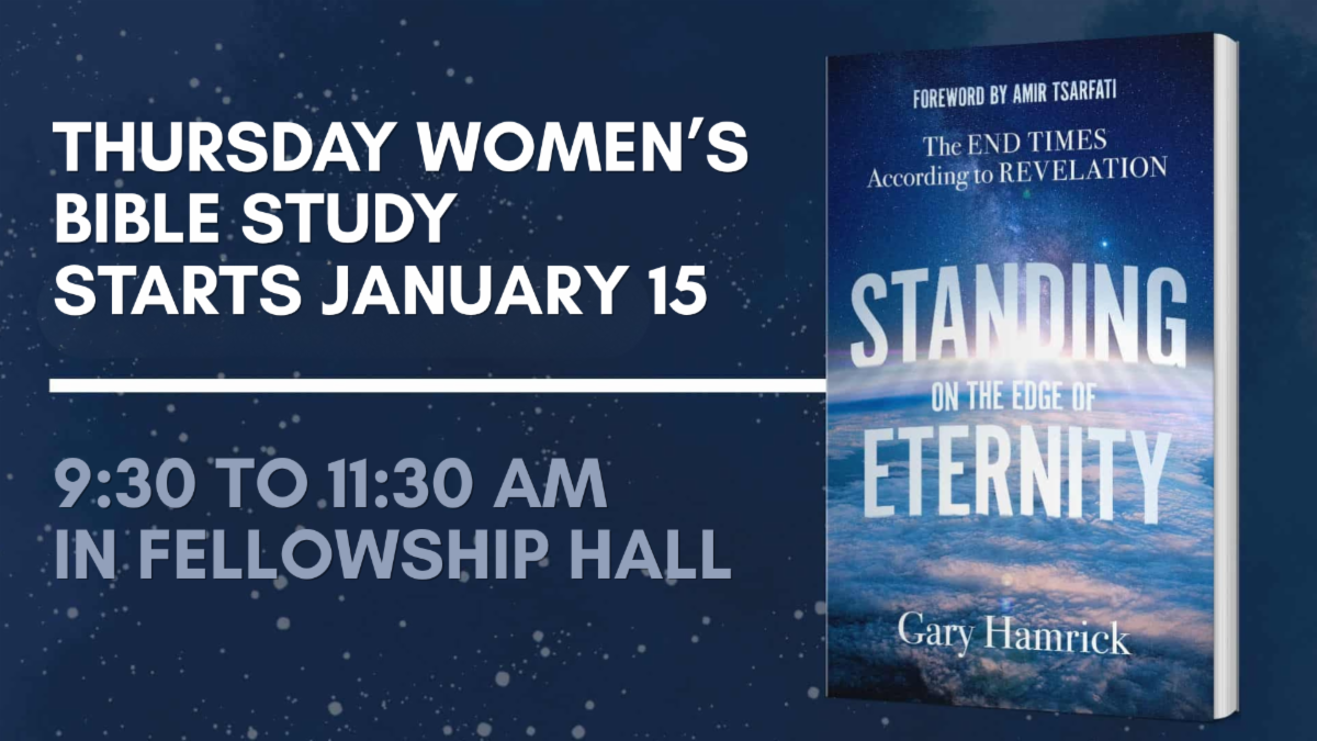 New Year | New Study for Women—Thursdays, January 15 through May 21, 2026 from 9:30 to 11:30 AM in Fellowship Hall. Join us as we begin our journey through Standing on the Edge of Eternity. This book and video study by Pastor Gary Hamrick explores End Times according to Revelation. Women of all ages are welcome to attend. Please purchase the book in preparation for the study. Reading assignments and study questions are included in the book. No sign-up required. Questions? Email Dana Ator at dana.ator@gmail.com.