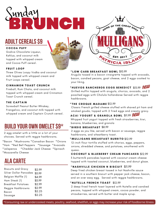 Join us at Mulligan's TODAY! We will be open 10 AM - 9 PM and serving Brunch from 10 AM to 2 PM!