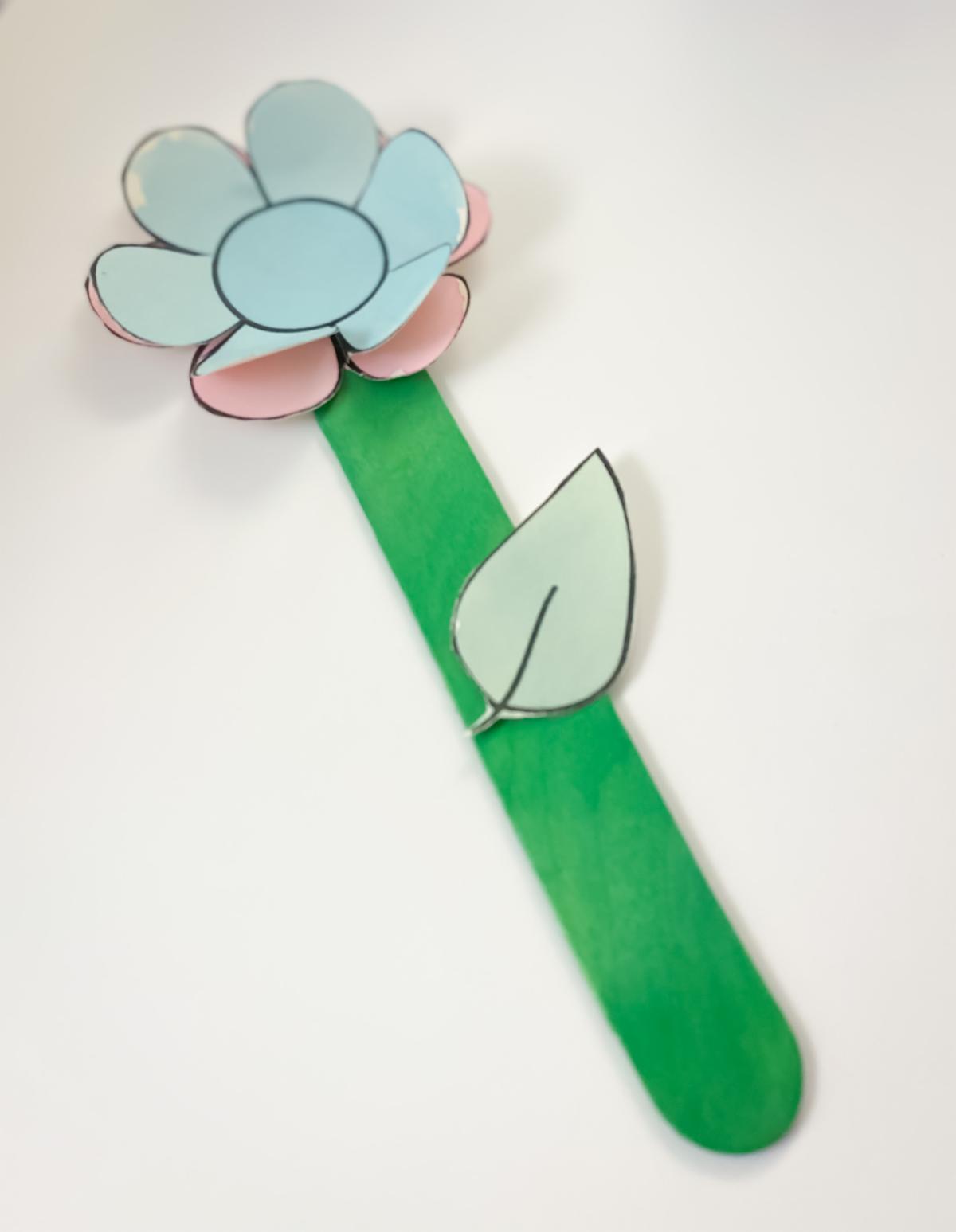 The children used watercolor paint to paint flowers and leaves. After painting, they cut and glued their flowers and leaves to a painted popsicle stick. The children were encouraged to write special notes on the petals if they would like.