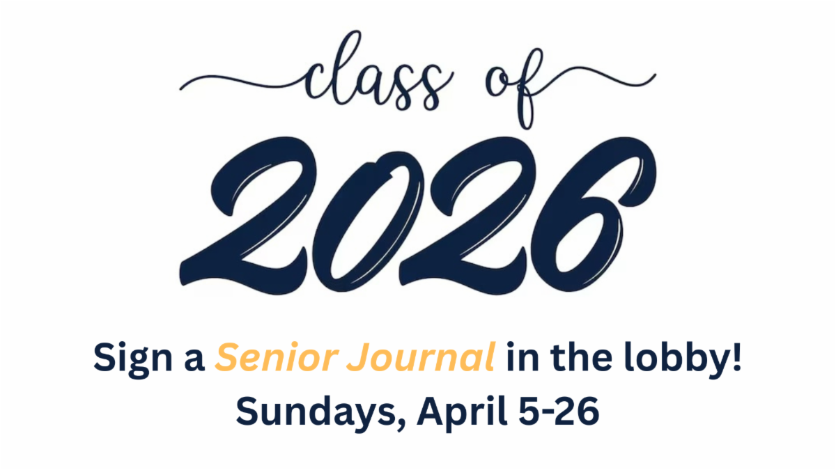 Sign Senior Journals Sundays through April 26. Stop by the tables in the lobby to write notes, prayers, affirmations, favorite memories, Scriptures, or words of encouragement in personalized journals for our graduating high school seniors.