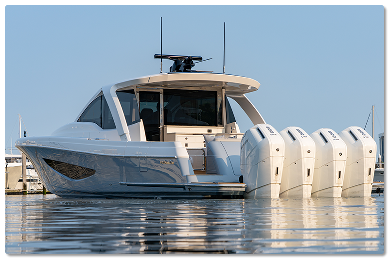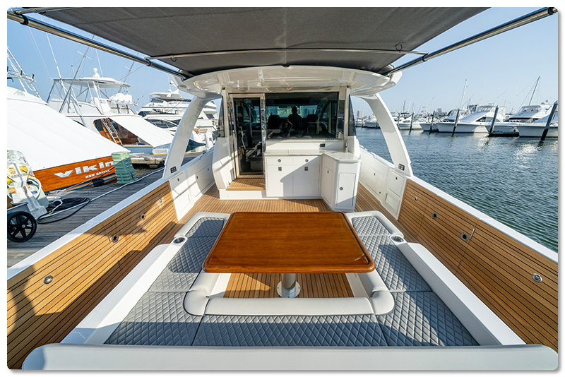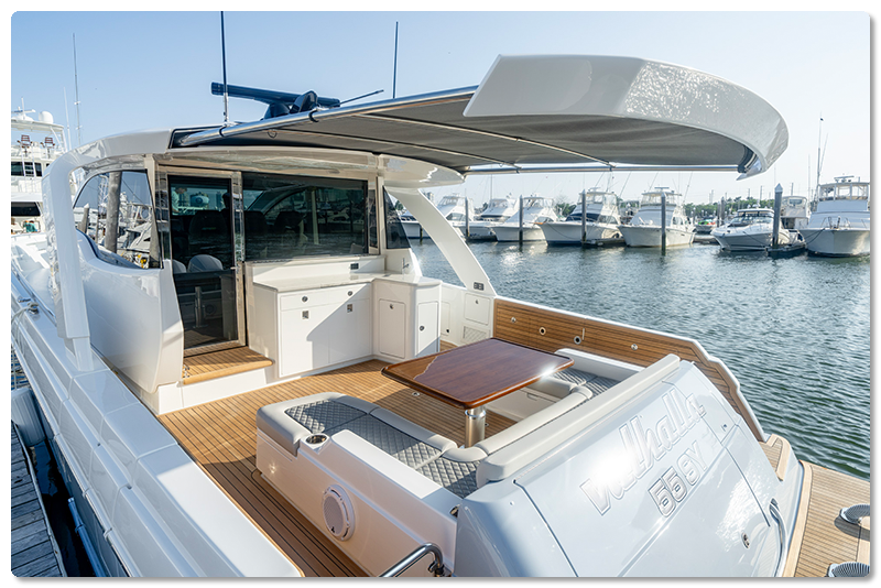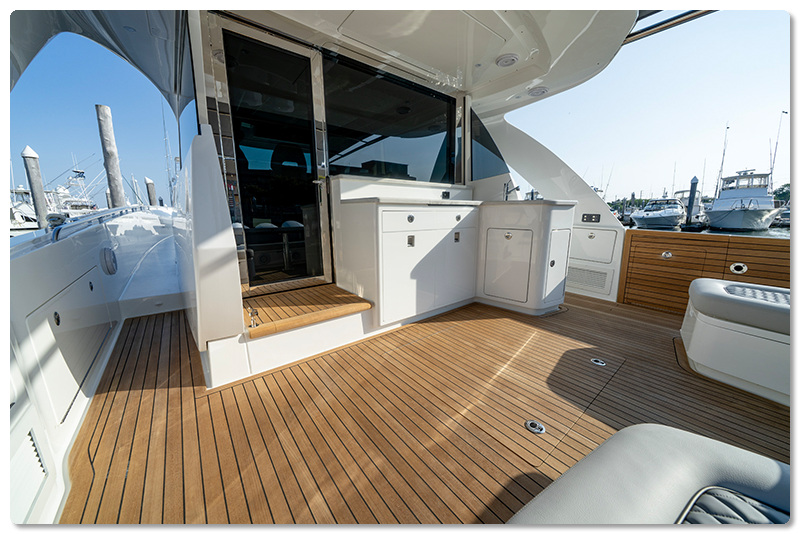 The yacht is offered with several summer kitchen configurations, including this layout with a three-quarter galley with an L-shaped counter. The aft bulkhead features a large portside glass door to the pilothouse, and the adjacent powered window can be lowered at the touch of a button. Concealed in the pilothouse overhang is a large drop-down HDTV. Also note the wide sidedeck, which provides safe and easy access to the bow and its lounge. |