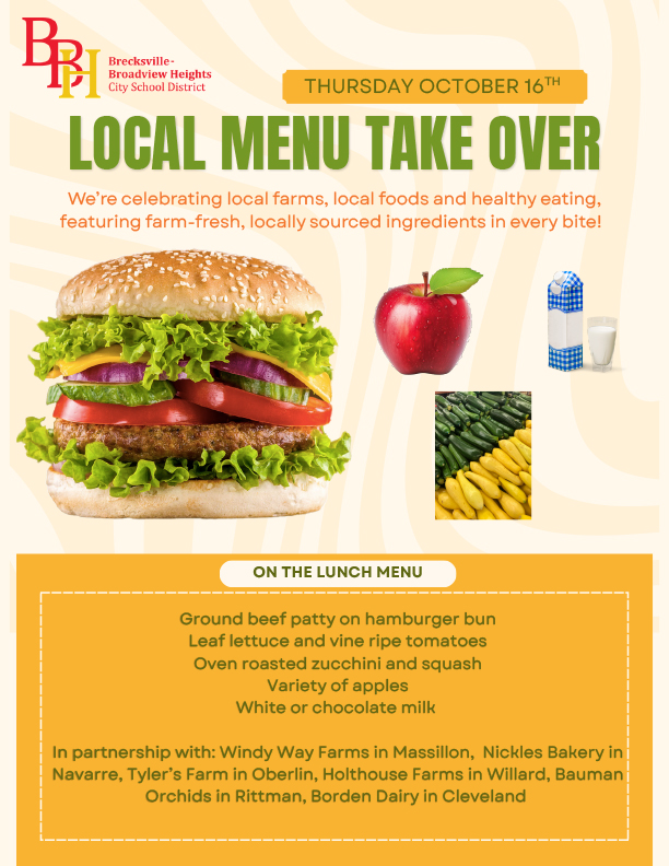 Our dedicated food services team is encouraging us all to celebrate National School Lunch Week throughout the week of October 13th. This week is designed to promote the importance of a healthy school lunch in a child’s life and the impact it has inside and outside the classroom. Our food services team is led by Amy Voigt, our dedicated and talented Supervisor, and a valuable team who tirelessly work each and every day to ensure that our students are not only fed but nourished. See the nearby graphic to learn how we are selecting tomorrow, Thursday, October 16th to make a special luncheon treat with a local farm-to-table twist, called our local menu takeover.