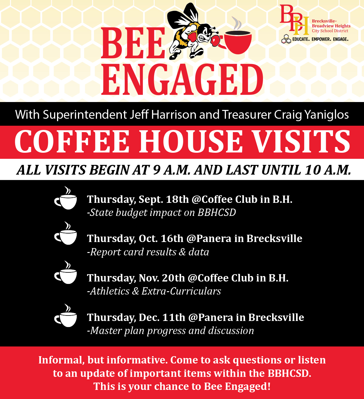 An important part of our strategic plan is communications and engagement with the stakeholders of our community. After a positive response from last year, we're kicking-off our Coffee House visits tomorrow, Thursday, September 18th at the Coffee Club in Broadview Heights from 9 a.m. - 10 a.m. to discuss the important matter of state budgeting and district finances. See the above graphic that helps to promote a topic per coffee house visit, rotating between Broadview Heights and Panera Bread in Brecksville. Hope to see you there to learn, to ask questions, and to engage.