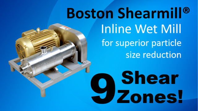 The Boston Shearmill is your solution for inline wet milling and superior particle size reduction. This heavy duty machine will mix, disperse, emulsify, pulverize, macerate, crush and homogenize to your desired levels.