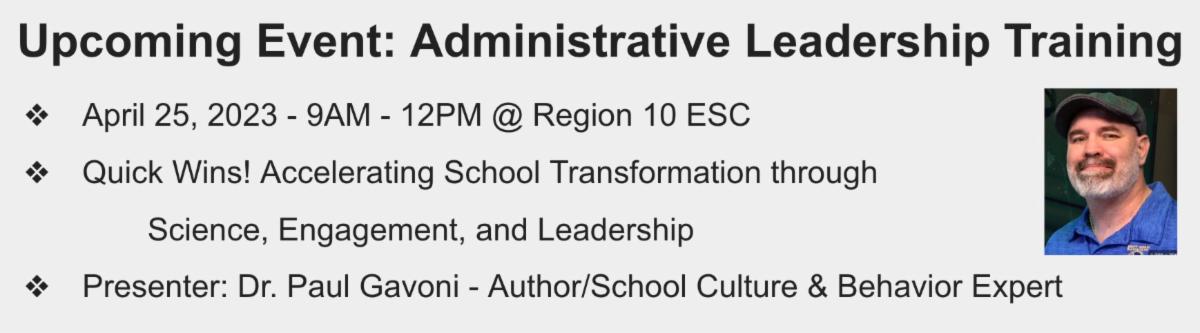 Want to make adjustments to your school culture as you begin to prepare for the 2023 - 2024 school year? This training will address how to continuously improve climate, culture, and student achievement by reducing behavioral problems through 5 practical leadership and coaching principles grounded in the science of human behavior. Educational leaders will learn research based strategies in establishing a culture that positively influences the behavior of teachers so they can positively influence the behavior of students.