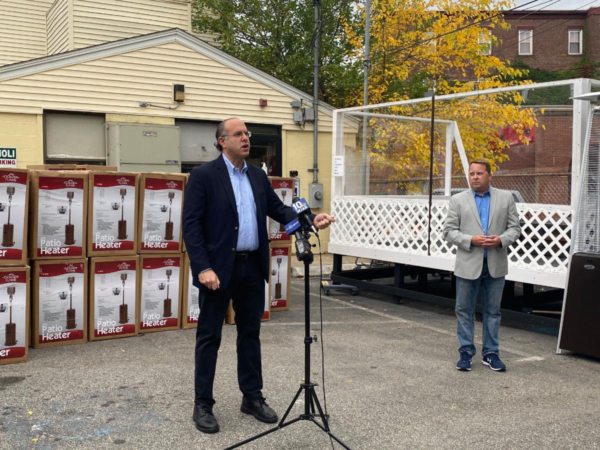Rhode Island Commerce Secretary Stefan Pryor and Federal Hill Commerce Association Executive Director & EGN Consulting President Rick Simone distribute heaters sourced by SupplyRI to restaurants on Federal Hill for al fresco dining