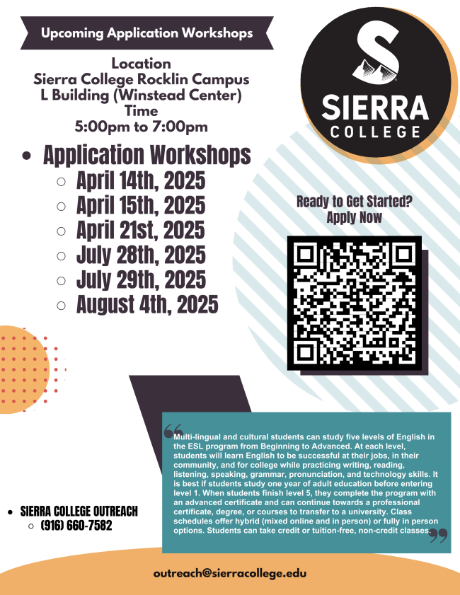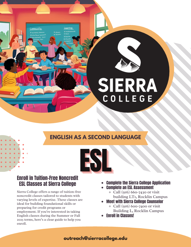 Sierra College offers tuition-free noncredit ESL classes designed for learners at all levels—from beginners to those preparing for college credit courses or employment. These supportive and skill-building classes are a great way to improve your English and take the next step in your education or career.