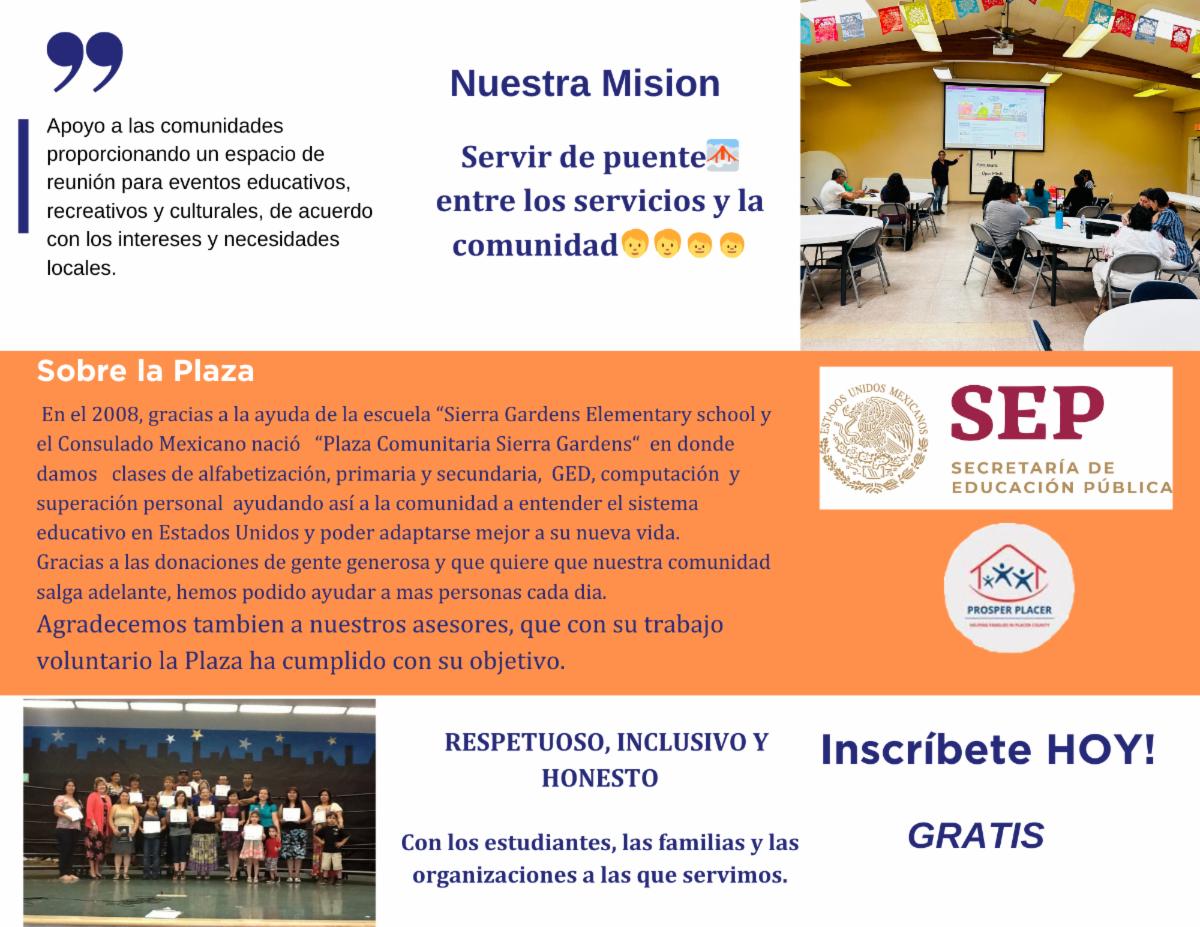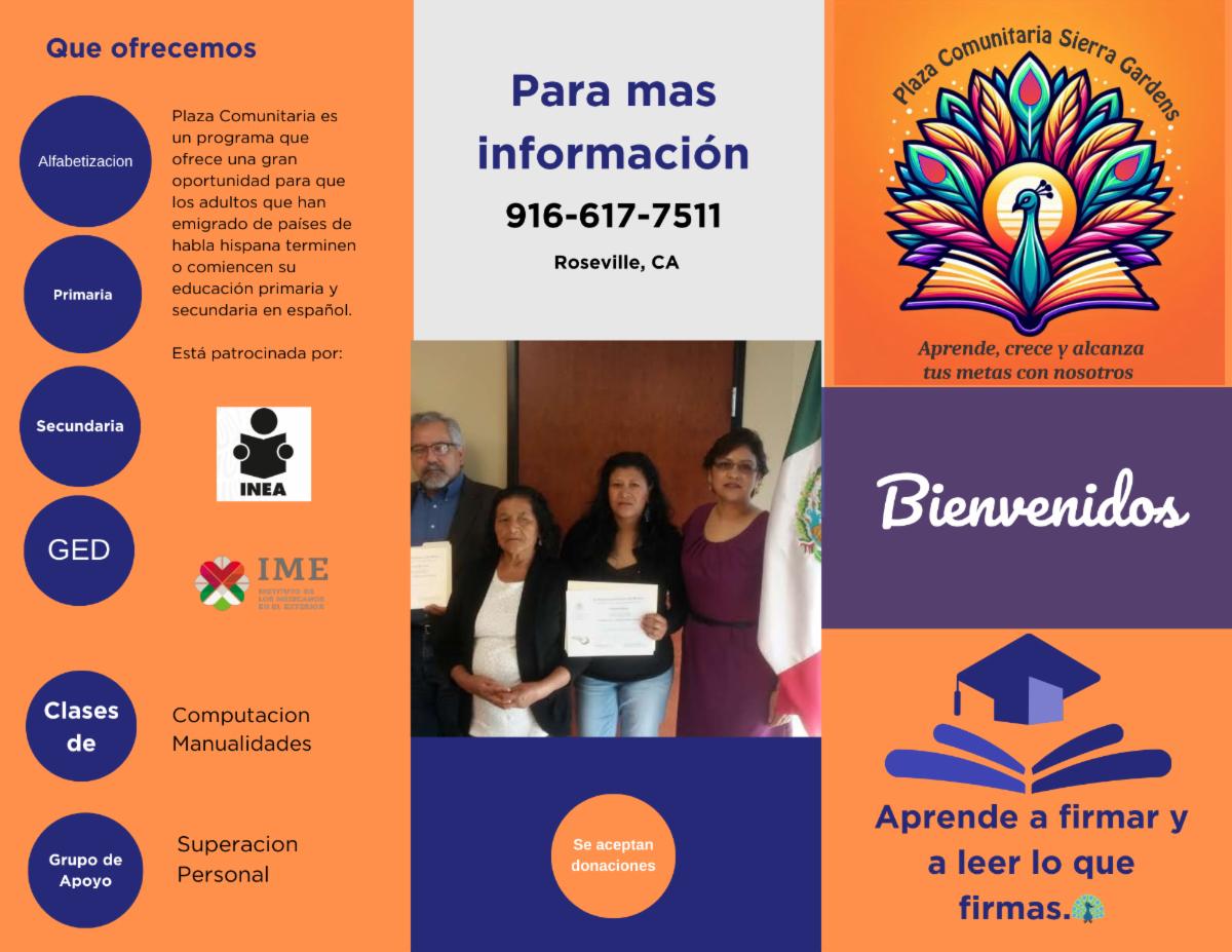 Plaza Comunitaria Sierra Gardens in Roseville offers tuition-free classes in Spanish to help adults start or continue their education. Programs include literacy, elementary and middle school education, GED prep, computer skills, arts and crafts, and personal growth workshops.