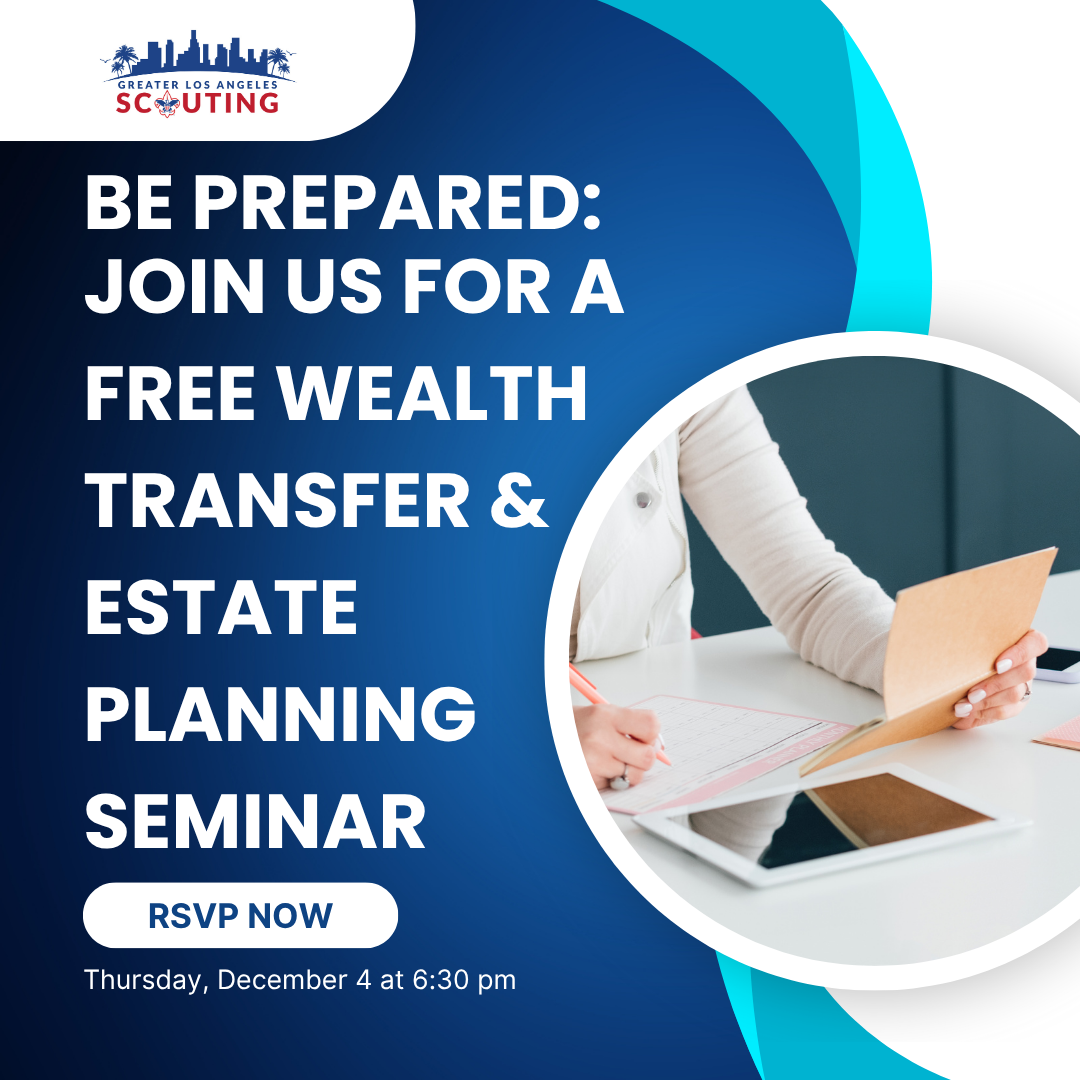 Greater Los Angeles Scouting invites you to a special Generational Wealth Transfer & Estate Planning Seminar on Thursday, December 4, at 6:30 pm at the Cushman Watt Scout Center (2333 Scout Way, Los Angeles, CA 90026).