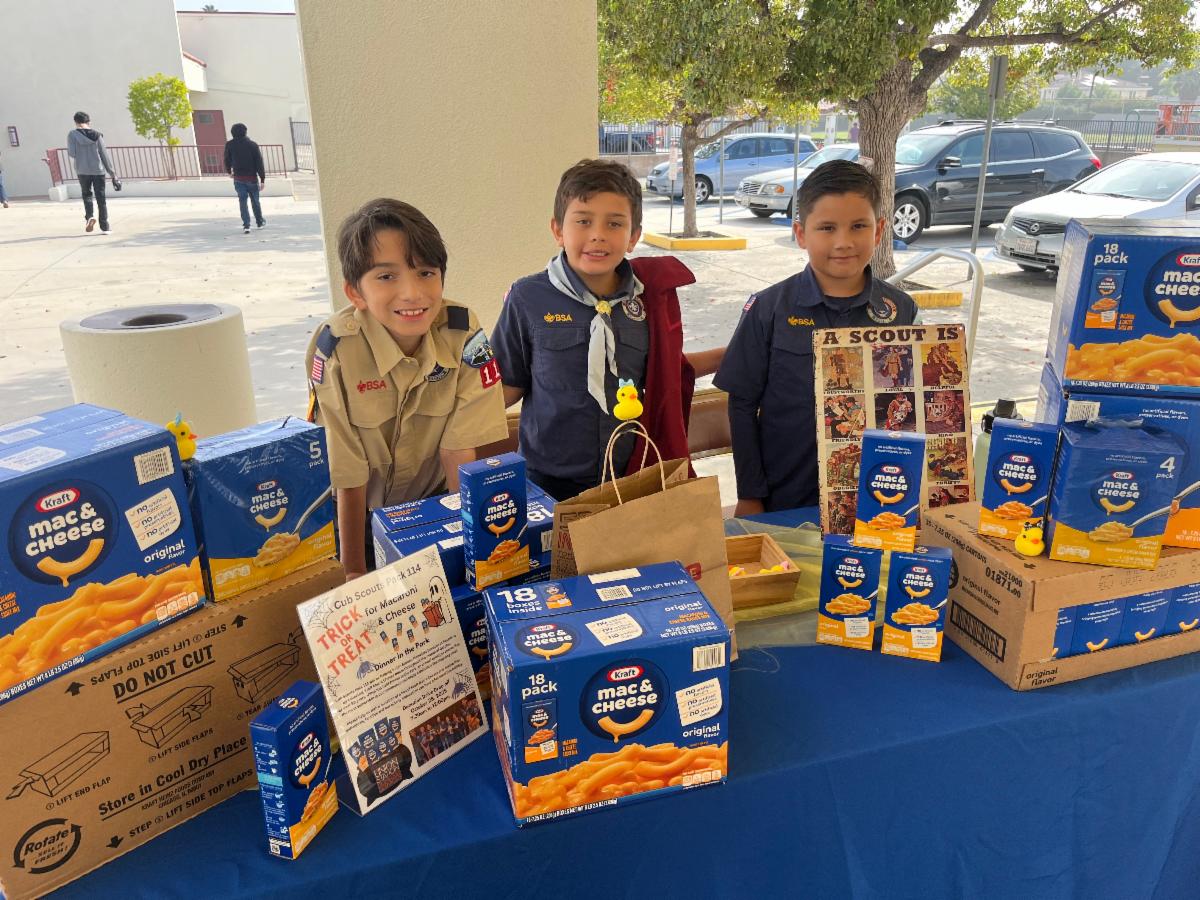Through the month of October, Pack 114 launched a special service campaign to support Union Station Homeless Services (USHS) of Pasadena by collecting boxes of macaroni and cheese. Our project, “Trick or Treat for Macaroni & Cheese,” rallied our Scouts and community to help contribute to USHS’s long-running Dinner in the Park, which for over 50 years has provided thousands of meals to community members in need—including children, families, and the elderly.