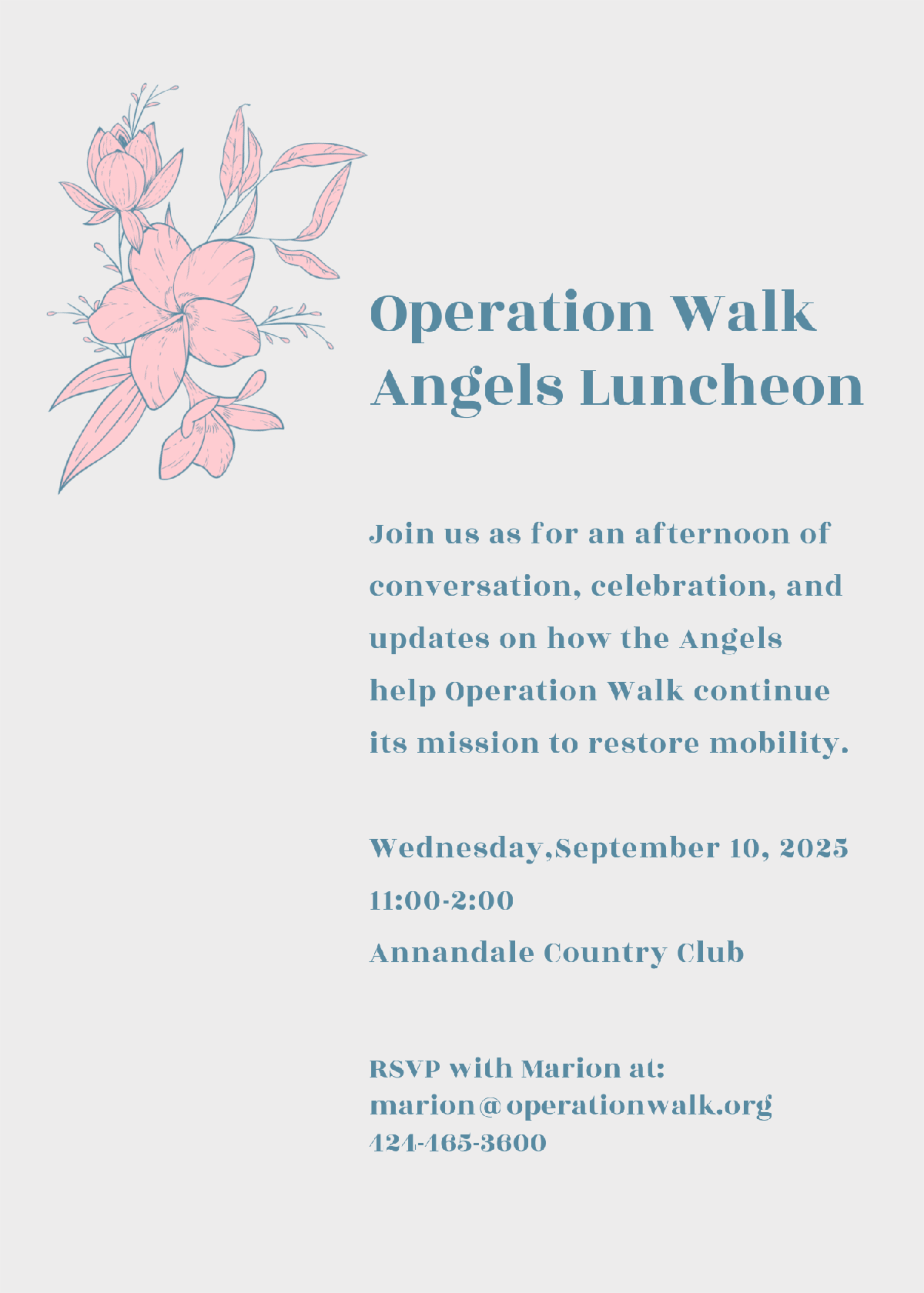 To RSVP please contact Marion at marion@operationwalk.org or call our office at (424) 465-3600. There is no financial obligation, all donations are greatly appreciated but not required to attend.