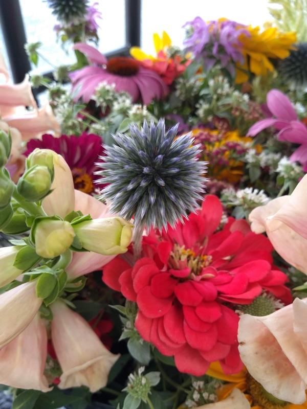 The summer blooms are in full swing at Holy Cow Farm. The neat thing about a local flower farm is that the flowers come and go as the seasons change, and the latest exciting bloom is the echinops flower. These silvery blue bursts of color are starting to come in and will be featured in this week's bouquets. They add a cosmic texture to an arrangement, are long lasting, and can even be dried for a permanent spot on the table. Be sure to stop by and check out echinops and all the other beautiful blooms (and baby Charles) at Holy Cow Farm this weekend.