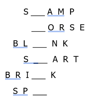 One of my favorite kinds of puzzles is called Key Word. Look at a series of words, each with a blank, and fill in the blanks to make a new word. The trick is that there are at least two possible letters to fill in each blank. For example, in the word C H __ C K, the missing vowel could be E, I, or U. I could have written a trivia quiz on cheese (I have actually done so) but that seemed too heavy for this issue. Instead the word that fits in the blanks below is something I strive for in every Wait Lifter issue. (The illustration has nothing to do with the words with missing letters. It just amuses me.)