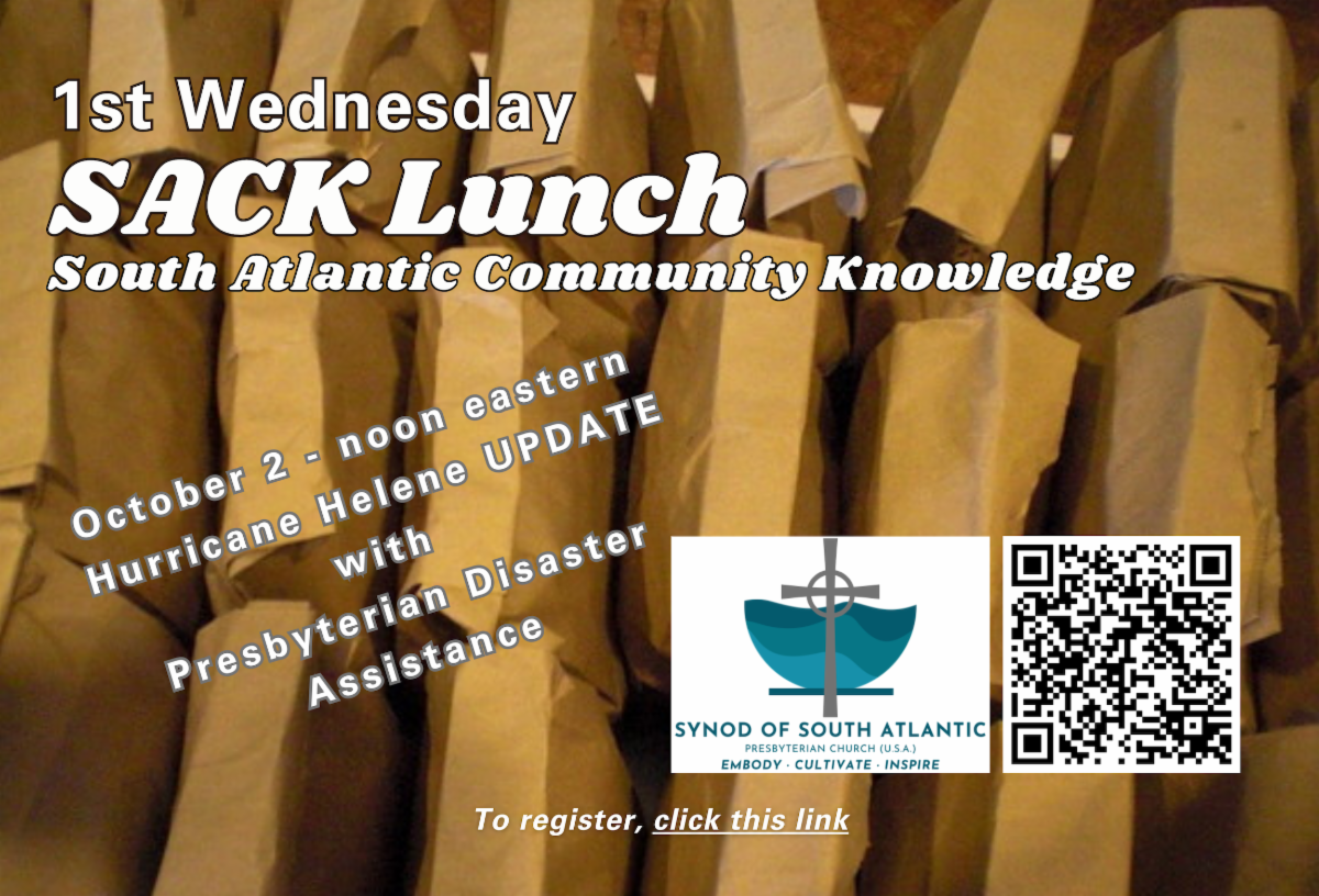 This Wednesday’s SACK Lunch conversation has been changed to provide an update on the impact of Hurricane Helene and how individuals and churches can help the current and long-term recovery efforts.