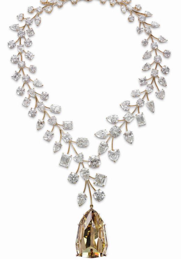Here we have the "Incomparable," a huge 407.48 carat, Internally Flawless, Fancy Deep Brownish Yellow, modified shield shape step cut. It gets sold, and then recut into a 303.10 carat Fancy Deep Brownish Yellow modified pear shape, and renamed “the Golden Canary.”
