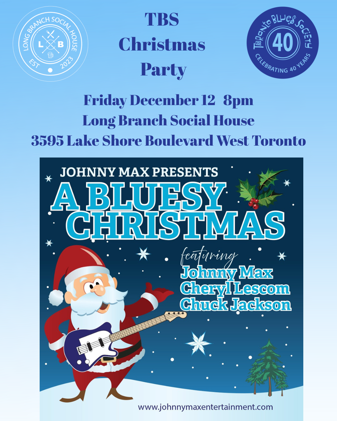 - Toronto Blues Society Christmas Party: A Bluesy Christmas Show at Longbranch Social House, 8:00 pm, 3595 Lake Shore Blvd W., Etobicoke