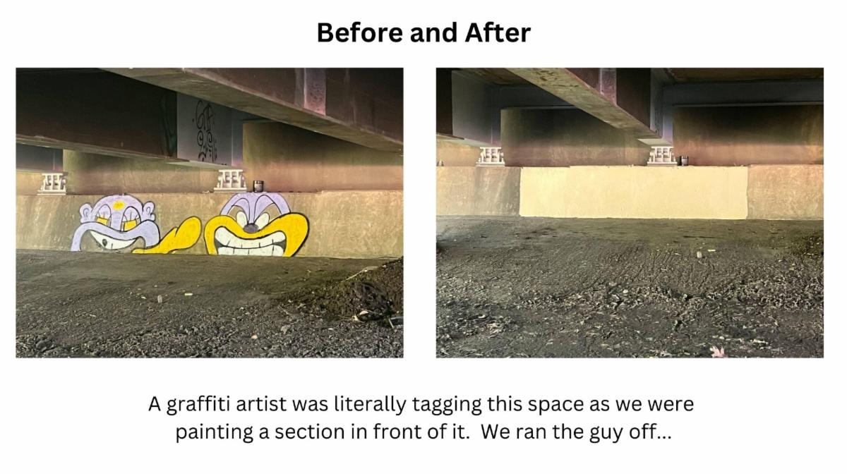 Crew members were instructed to painted over the graffiti, aiming to restore the area's aesthetic appeal. During the process, a graffiti artist was spotted painting on the section adjacent to the remediated area. TCA's crew promptly intervened, chasing off the artist and promptly painting over the new graffiti shown in the second picture.
