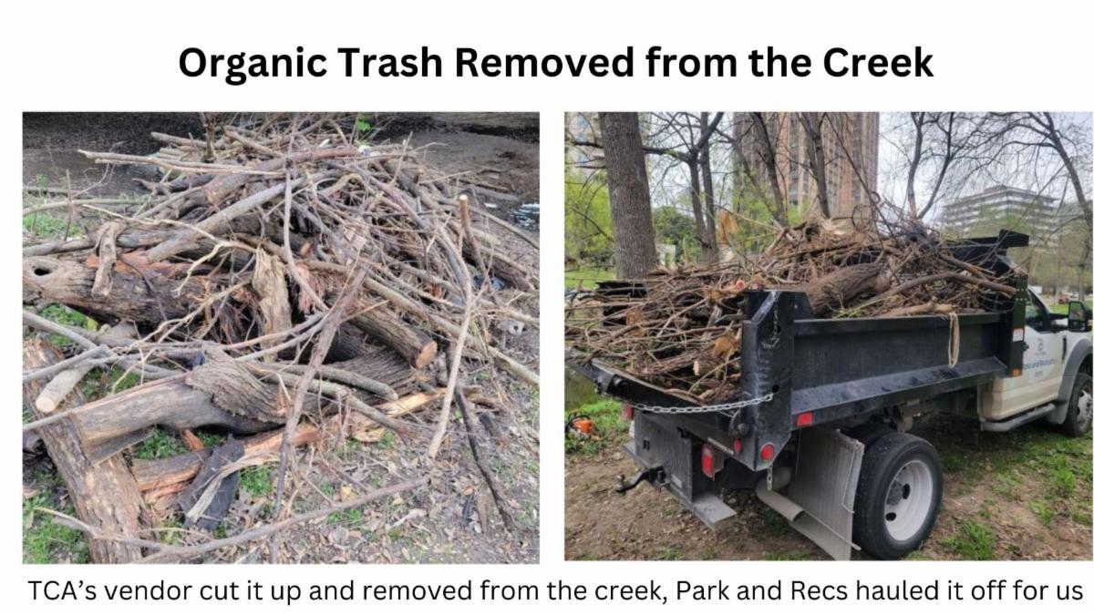 Challenges have arisen in the past regarding the removal of organic debris such as fallen tree logs and limbs, as city intervention was limited to instances obstructing storm drains. However, recognizing the detrimental impact of such debris on the creek's ecosystem, TCA has taken proactive measures to clear organic matter, thus mitigating future accumulation and promoting a healthier creek environment.