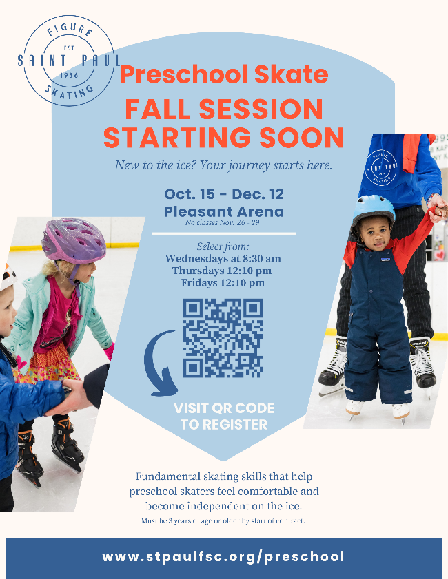St. Paul FSC’s Preschool Skate class is designed to help the preschool-age* skater develop preliminary coordination and strength to maneuver on the ice. This class will teach fundamental skating skills to preschoolers, so skaters feel comfortable and become independent on the ice. Classes are 30 minutes in length.