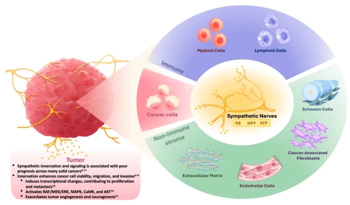 Dr. Kyprianou and colleagues review the current evidence on the multidirectional impacts of sympathetic nerves and both immune and non-immune tumor microenvironment (TME) components, the nature of these communication processes, and how exploring these interactions may inform future therapeutics to impair cancer progression and metastasis. The studies reviewed emphasize the need to map the spatial profiles of multidirectional interactions within the TME, including the distance-dependent effects of sympathetic signaling. Such quantitative insights will be pivotal in developing computational models to predict the molecular and phenotypic changes resulting from combinatorial treatments.