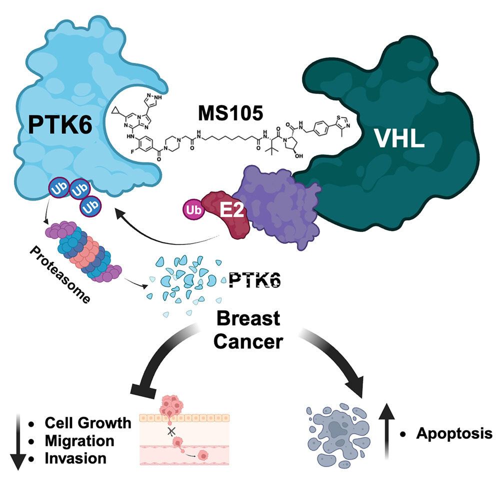 Dr. Irie and colleagues report that MS105, a PTK6 PROTAC degrader, induces apoptosis of breast cancer cells by targeting kinase-dependent and independent functions of PTK6. Findings support PTK6 degraders as a preferred approach to targeting PTK6, an oncogene in breast and other cancer types (prostate, gynecological, liver). Ongoing studies are evaluating the in vivo efficacy of MS105.