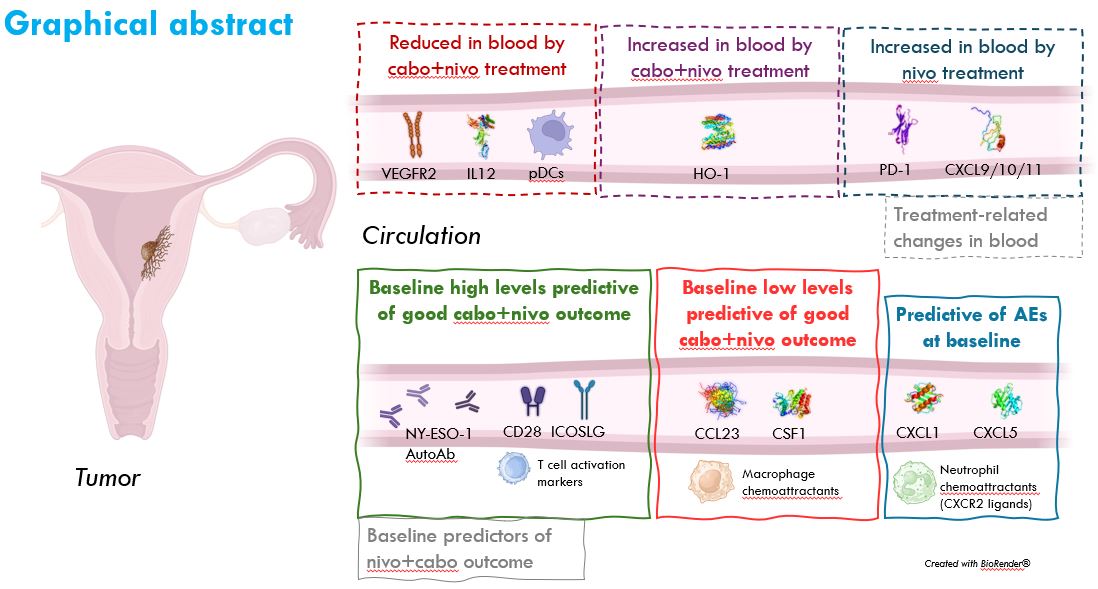 This work, focused on defining biomarkers of novel immunotherapy treatment, is the first in-depth correlative analysis of an antiangiogenic + checkpoint drug combination in recurrent endometrial cancer. Authors found blood plasma proteins predicting clinical response to combination treatment, with macrophage-related and T cell activation markers associated respectively with poor and improved survival. The implications of the mechanisms unveiled through this study point to developing future treatments that may counteract the negative signals observed while boosting the immunogenicity of the tumor to further improve responses. If confirmed in future studies, the biomarkers defined here would be a potential way to screen for patients more likely to respond to immunotherapy treatment vs. those who may not benefit.