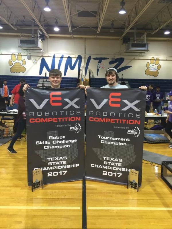 At the South Texas State Champs last weekend, TCHS team 590M, with drive team members Jaeden Johnson and Brett Meyer, were awarded the Judges Award as special recognition for efforts leading up to and during the event. Team 590V, with drive team members Zach Smith and Dillon Harvey, were named Robot Skills Champions for the top combined programming and driving skills challenge score. For the elimination rounds, team 590V were chosen as part of the 1st seed alliance with team 3118B from Clear Creek ISD and team 400X from Ball High School. The alliance went on to win the tournament which featured a final round of robots all from Galveston County. The robotics team will once again compete at the 2017 VEX Worlds in Louisville, Kentucky April 18-22.
