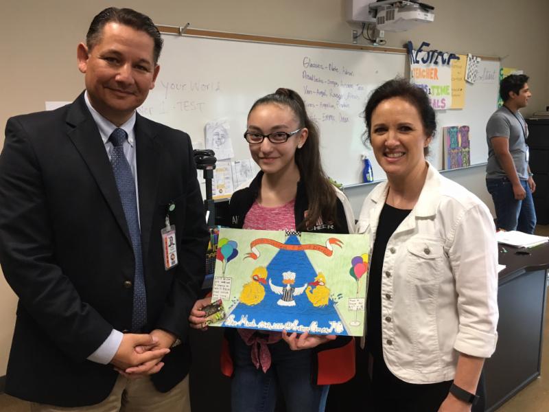 Congratulations to Alexis Alcocer from Blocker Middle School for winning this year's Duck Derby Poster Contest. She received a $50 Walmart gift card from the Foundation. She is pictured with the Director of Performing and Visual Arts Joseph Figarelli and Blocker Principal Julie Southworth.