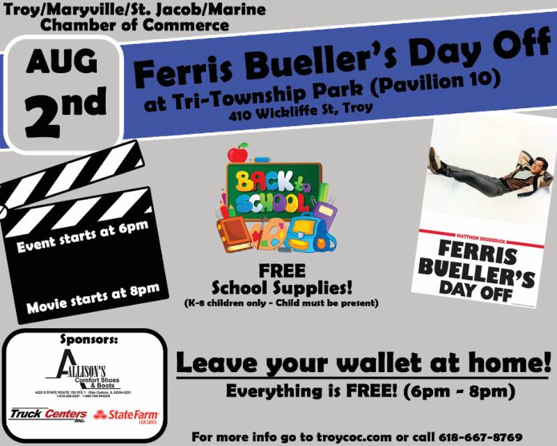 Come out to the Tri-Township Park (Pavilion 10) for the third of four Movie Nights in 2019! We will be showing the classic Ferris Bueller's Day Off at dusk! We will have tons of great entertainment from 6pm to 8pm including bounce houses, face painters, characters, and much more! Free hot dogs/hamburgers, water, chips while supplies last!