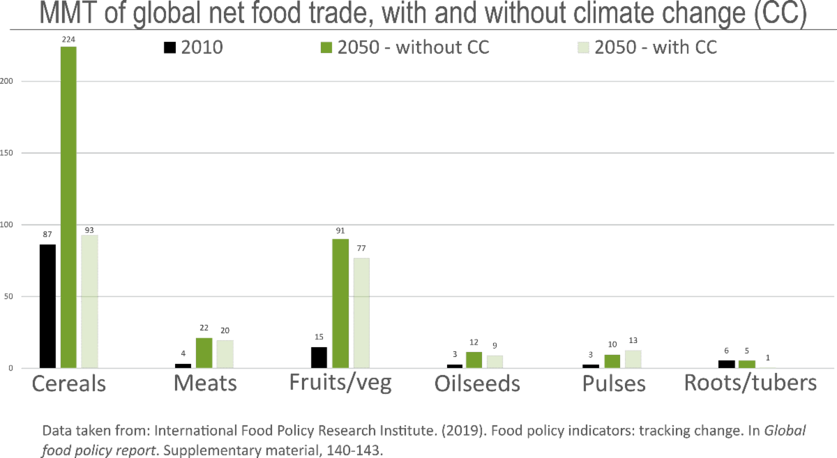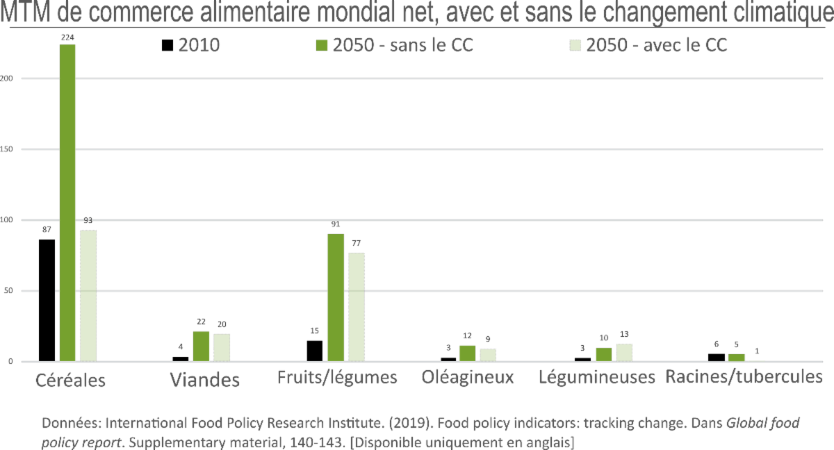 Le graphique de ce mois-ci illustre la relation entre le commerce international, l'environnement, et la sécurité alimentaire. Les barres noires indiquent les quantités de commerce international net de denrées alimentaires en 2010 dans six groupes: céréales, viandes, fruits et légumes, oléagineux, légumineuses, et racines et tubercules. Les barres vert foncé indiquent les quantités prévues en 2050 en l'absence de changement climatique: plus qu'en 2010 pour chaque groupe de produits, à l'exception des racines et tubercules. Les barres délavées, en revanche, indiquent les quantités prévues en cas de changement climatique: elles sont inférieures aux prévisions sans changement climatique dans tous les groupes de produits, à l'exception des tubercules. Les chiffres avec changement climatique représentent une augmentation de la température de 1,4 à 2,6 degrés Celsius dans les années 2046 à 2065 (International Food Policy Research Institute, 2015, tbl. G.3). Des valeurs plus faibles sont prévues avec le changement climatique en raison de la réduction de la disponibilité de l'eau et de l'augmentation des températures, ce qui diminue les rendements des cultures et du bétail (International Food Policy Research Institute, 2015, p. 13).