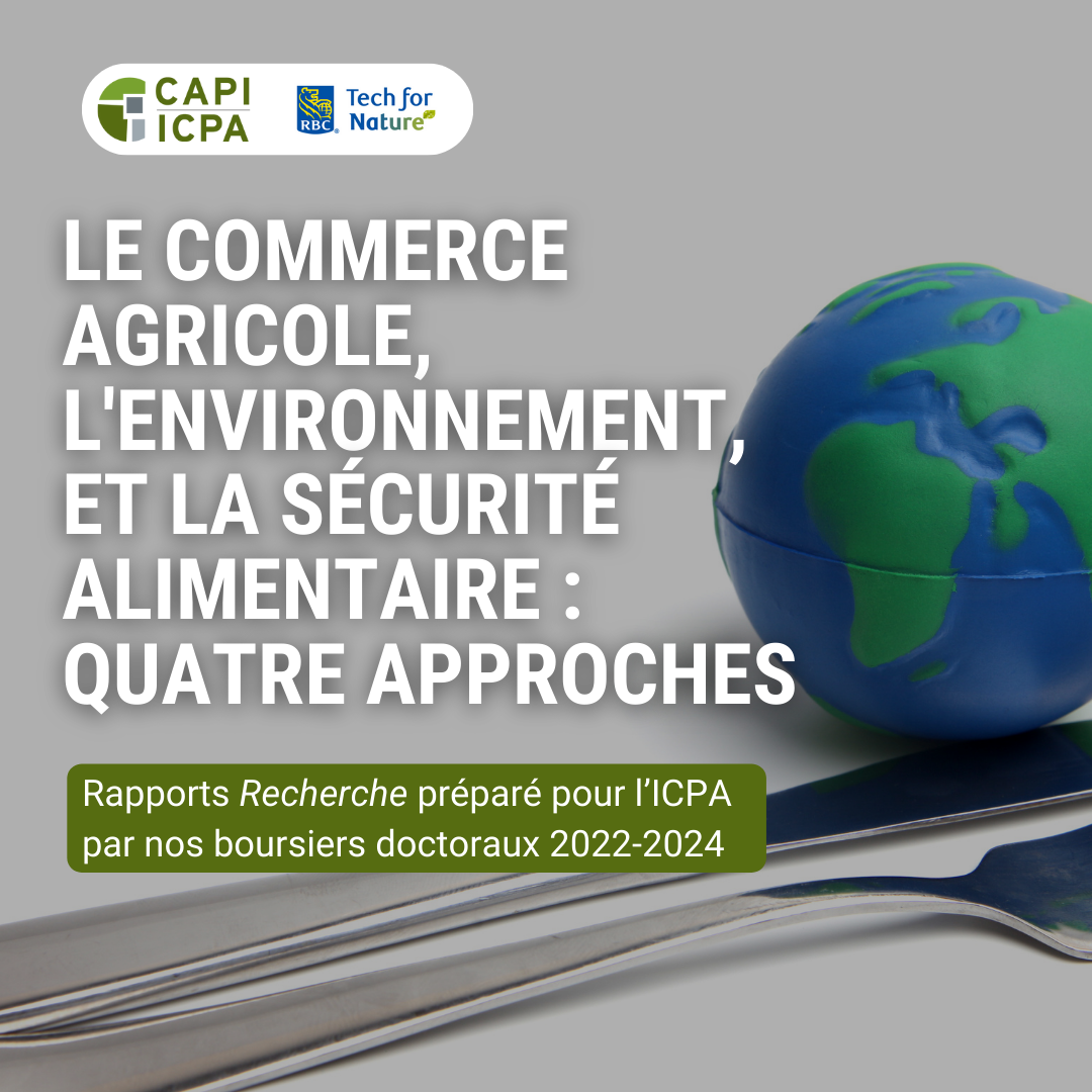 La troisième cohorte de boursiers doctoraux de l'ICPA (2022-2024) a été chargée d'axer leurs recherches sur l'intersection du commerce agricole, de l'environnement et de la sécurité alimentaire, et le présent document en est l'un des résultats. À la lumière des récentes perturbations commerciales, des préoccupations en matière de sécurité alimentaire et des engagements en matière de changement climatique, l'ICPA s'intéresse à l'impact de ces facteurs sur l'agriculture et l'agroalimentaire canadiens, ainsi qu'à leurs implications politiques. | |