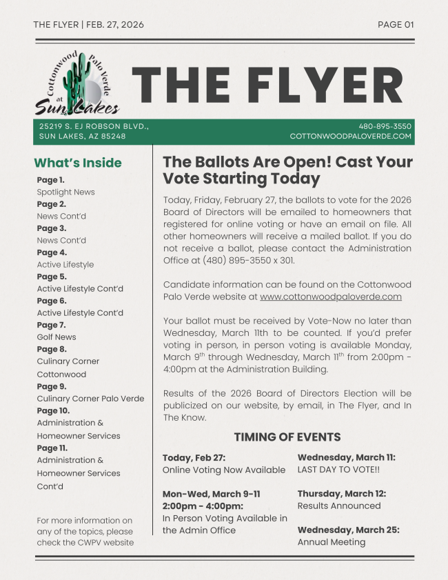 Stay up to date with all programs, information and activities in Cottonwood and Palo Verde by joining the Association's email list.
