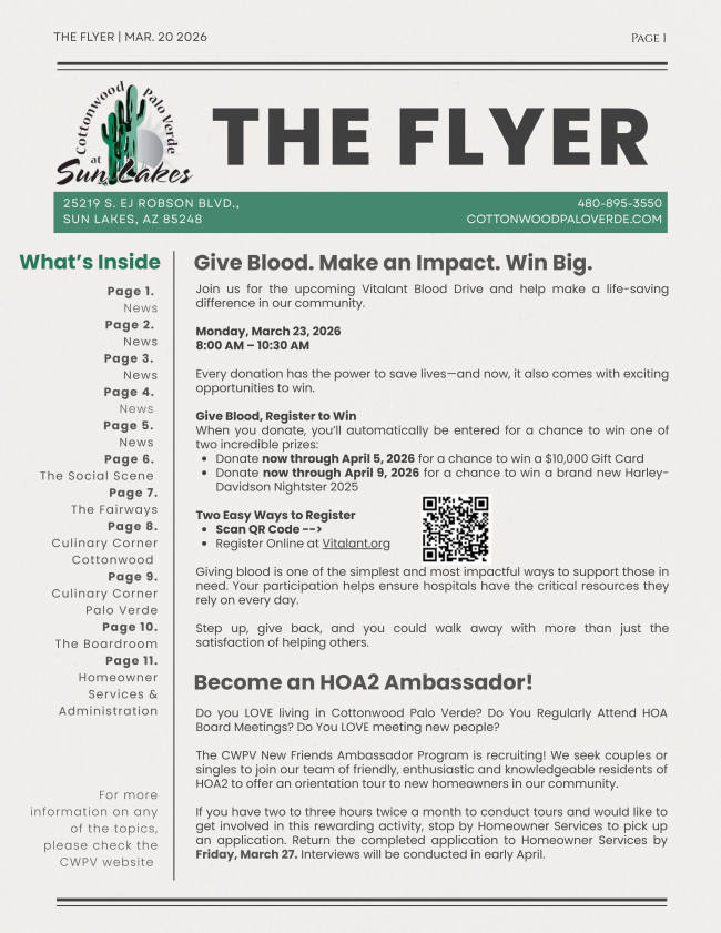 DISCLAIMER The materials comprising The Flyer are provided by Sun Lakes HOA#2 Management and Staff as a service to our members for informational purposes only. While every effort is made to ensure the information contained in "The Flyer" is accurate, errors may occur. We apologize for any inconveniences but will not be held liable or responsible for any such errors that may occur.