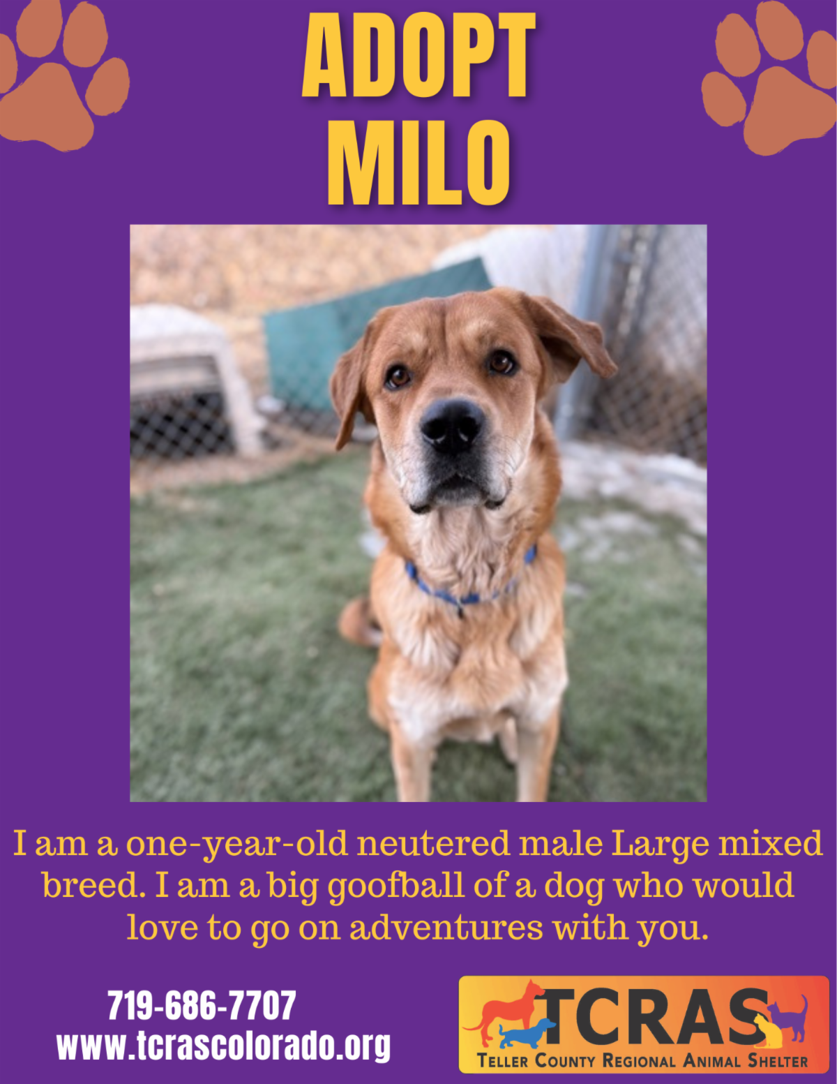Milo is a one-year-old neutered male, large mixed breed dog looking for his new family.
